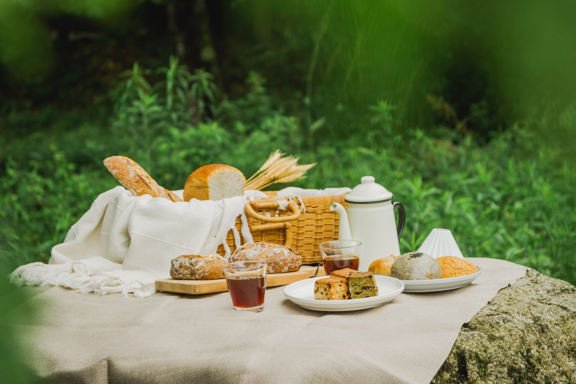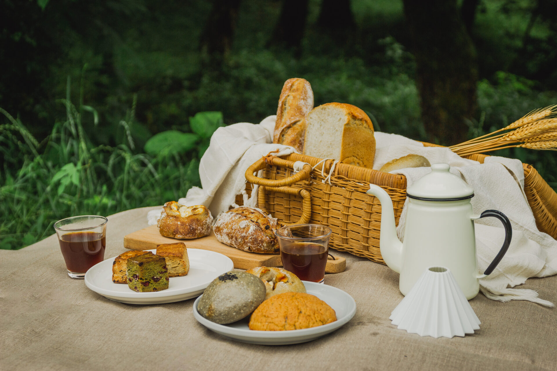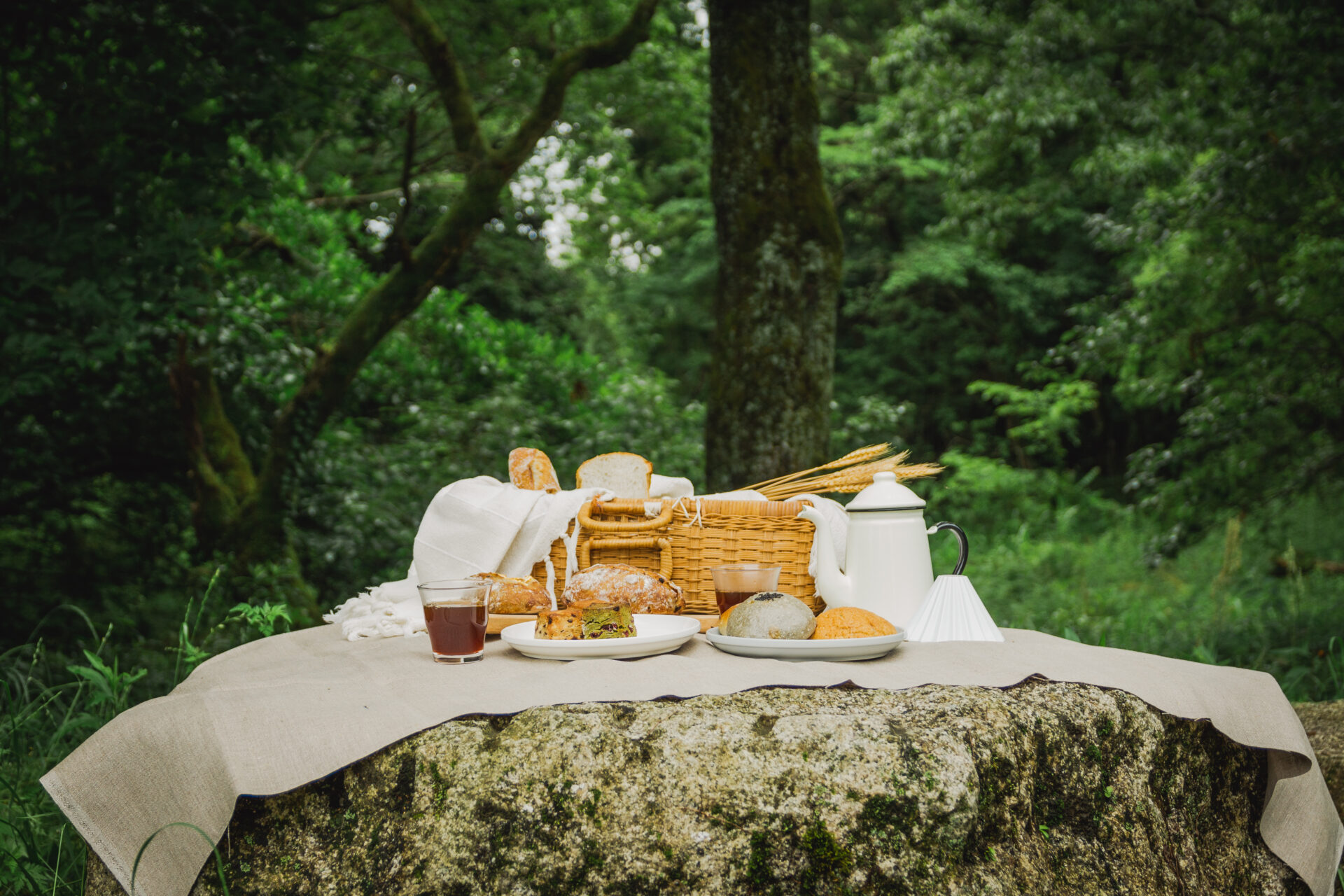 パンを並べるのに丁度良い大きな岩があり、そこでお皿とパンを並べて談笑しながら撮影をしました。