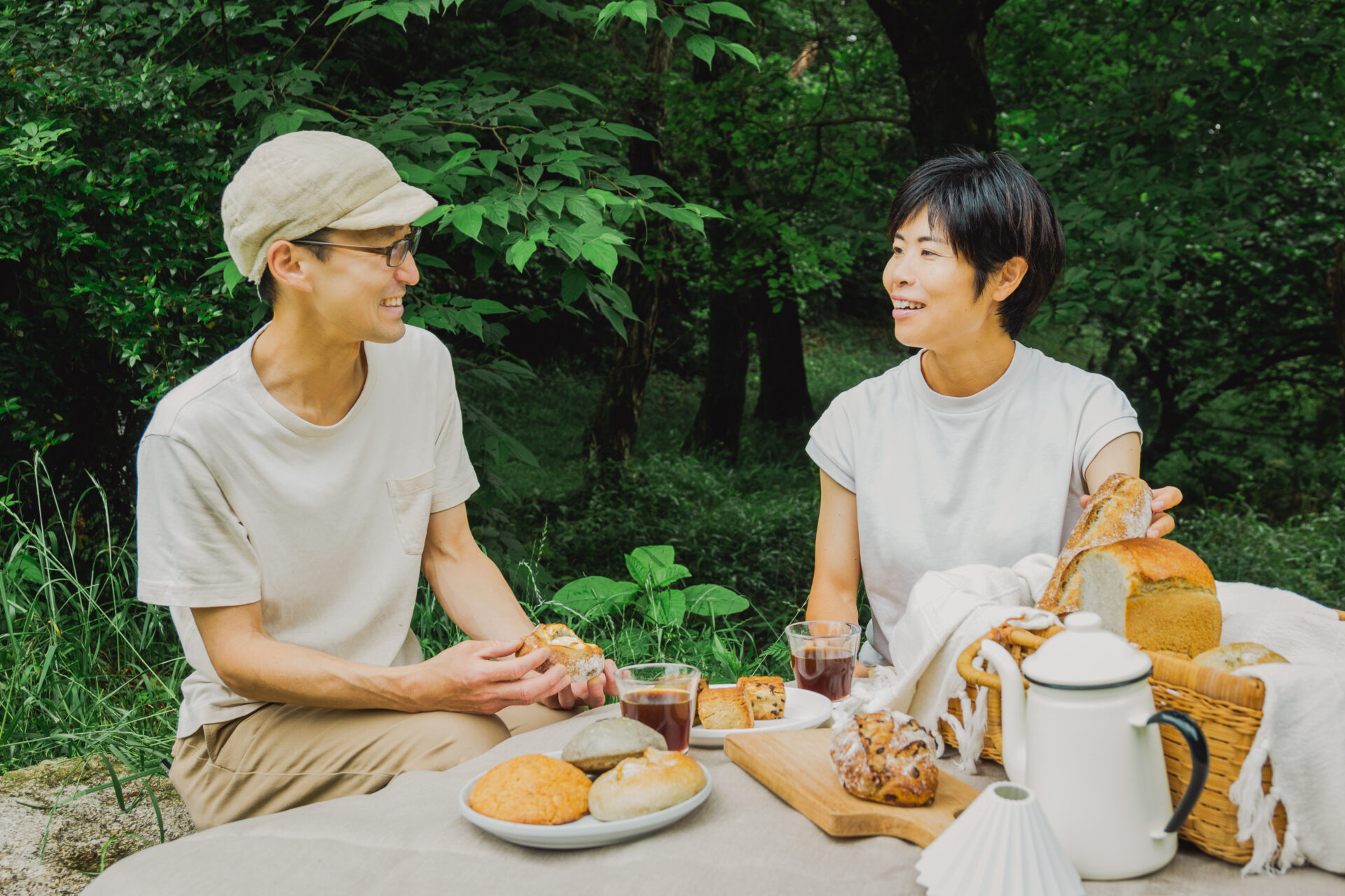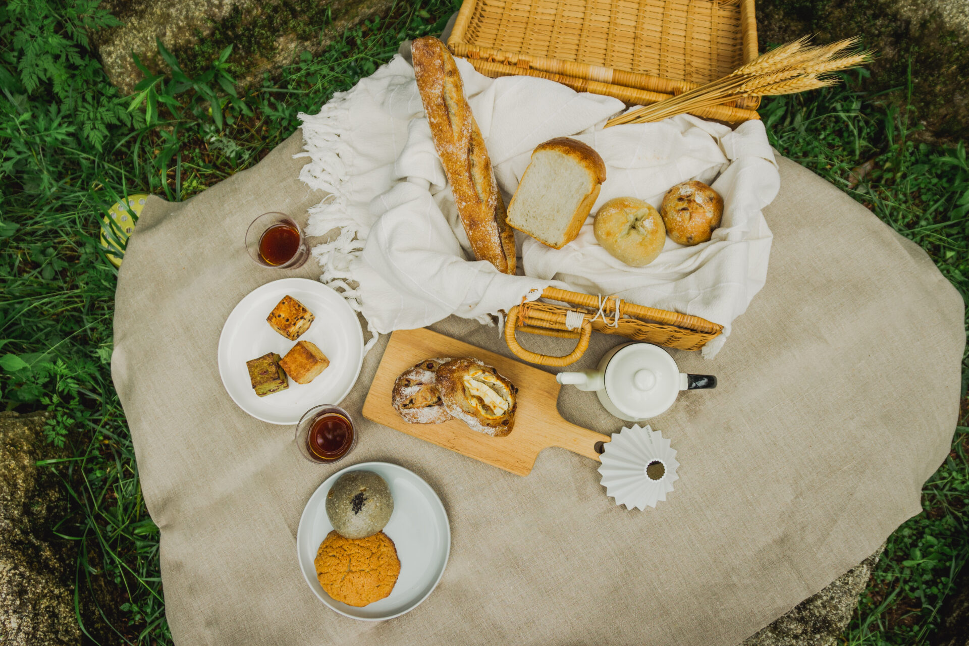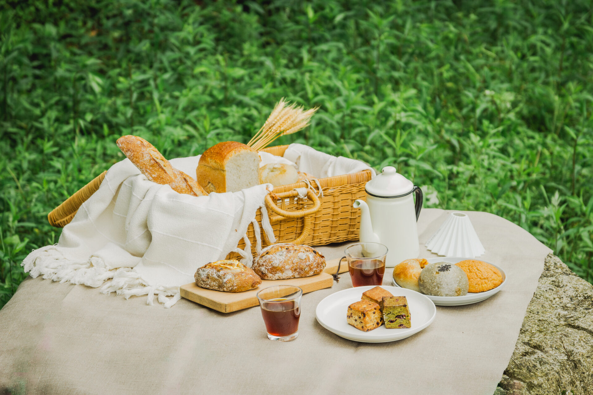 パンを並べるのに丁度良い大きな岩があり、そこでお皿とパンを並べて談笑しながら撮影をしました。